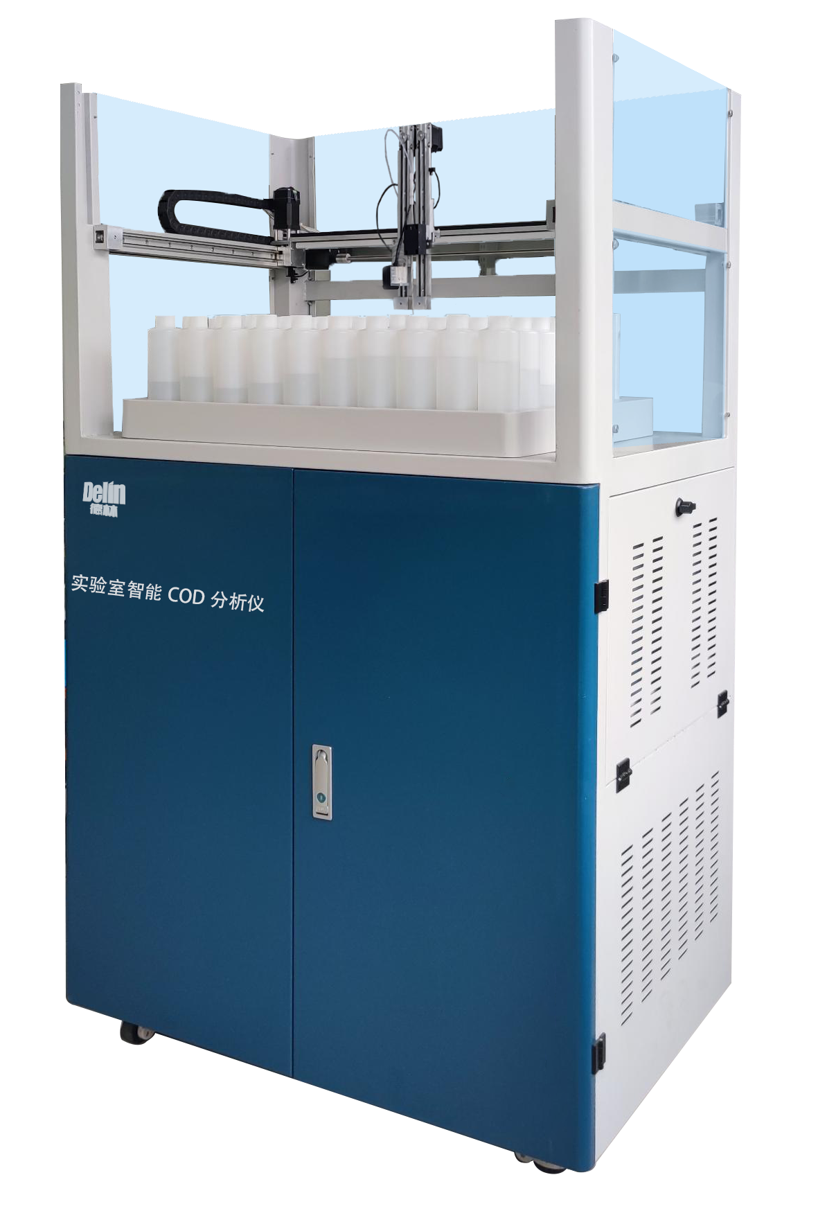 產品概述 DL1001型實驗室智能COD分析儀按照新標準HJ828-2017規定的手工測試方法與反應條件,采用先進的智能控制與消解技術,實現了實驗室COD批量自動化分析,取得和HJ828-2017規定的手工測試方法相同的結果。儀器配置的取樣器,操作簡單,只需將取樣瓶放入取樣架上,點擊儀器啟動鍵即可自動完成樣品的信息讀取、登記、樣品均化、取樣、做樣;同時,本產品能提前預判水樣的氯離子濃度和 COD值,并根據氯離子和COD的預估值,自動選擇合適的量程進行做樣,解決了市場現有儀器存在的樣品二次測定問題。儀器24小時無人值守連續工作,可測定樣品90個樣次,儀器使用時,直接連接電腦,其專用軟件控制儀器流程并對數據進行處理,用戶可通過無線網絡,利用手機等設備隨時監控儀器動態。 該儀器德林擁有完全自主知識產權,經8年的研發,集聚多項專利精心智造(專利號:201510525493.5;201511010214.8;201511010600.7;201510864190.6;201510855044.7;201610802016.3;201610801010.4;201710344194.0; 201920370855.1)。 適用范圍 該儀器適用于各級環境監測站、科研單位、檢測公司、運營公司、污水處理廠等機構進行實驗室批量COD分析。 儀器結構 實驗室智能COD分析儀由配液系統、協調系統、消解系統、滴定系統以及控制系統組成,是流動分析與經典容量分析的完美結合。